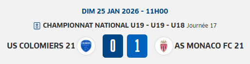 Conclusion : Score final 0-1. Colomiers sort de ce match avec des certitudes psychologiques après avoir fait douter le leader. De son côté, Monaco assure l'essentiel mais a péché par manque de réalisme en fin de rencontre, s'exposant inutilement jusqu'au coup de sifflet final.