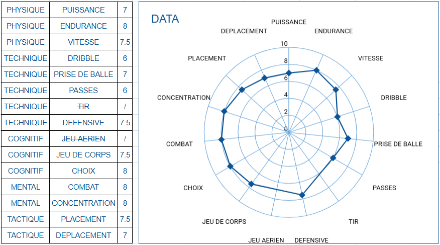 Profil Athlétique : Un joueur robuste sur ses appuis, doté d'une vitesse de course et d'une vivacité intérréssante. Il utilise son corps avec intelligence pour protéger le ballon ou s'imposer au duel.