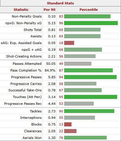 Auteur d’une prestation très aboutie, le joueur affiche un profil plus complet que ne le suggèrent ses statistiques défensives. Malgré sa taille (1m79), il fait preuve d’une réelle solidité, d’une excellente protection de balle et d’un timing aérien de haut niveau. Ses faibles données défensives s'expliquent par un strict respect des consignes tactiques : son positionnement très avancé (demi-espaces/milieu) l'éloigne structurellement de sa zone d'intervention initiale. Offensivement, il a fourni un travail important pour se démarquer, bien qu'il ait parfois manqué de soutien. Ses appels tranchants et sa qualité de percussion lui permettent de se projeter efficacement dans la surface adverse.