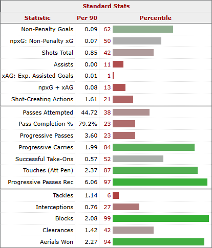 Points forts : Justesse technique dans le contrôle et la passe ; bonne utilisation du gabarit pour la protection de balle et les duels aériens.